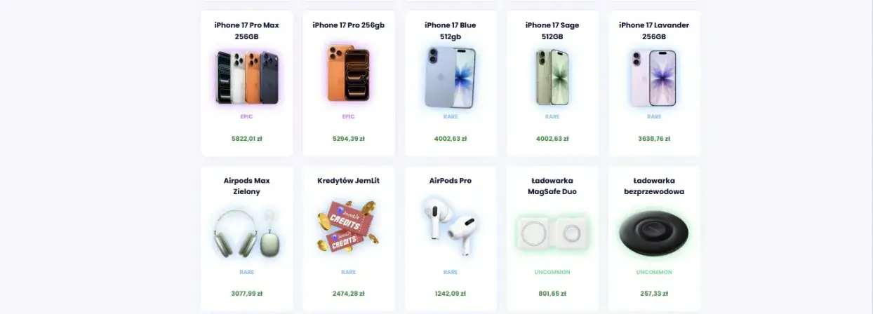 Głównym atutem jest wspomniana wymienialność nagród. Przykładowo, jeśli wybrałeś pudełko iPhone 17 i wylosujesz bezprzewodową ładowarkę o wartości 257,33 zł i stwierdzisz, że chcesz powalczyć o iPhone Pro Max, możesz odsprzedać wylosowany produkt za wspomnianą kwotę i spróbować swojego szczęścia ponownie.
